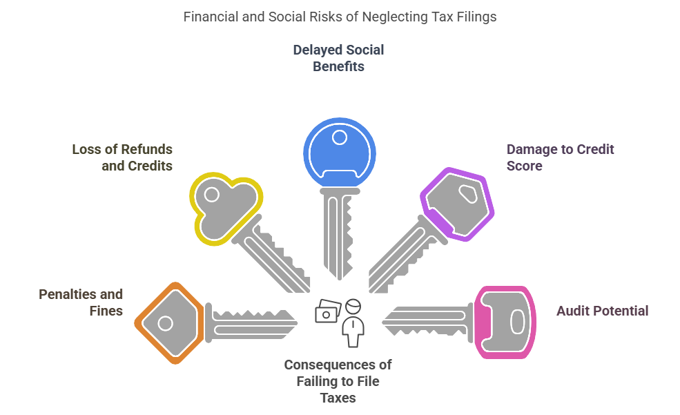 Failing to file taxes can delay or deny your access to social benefits, such as Social Security or Medicare.